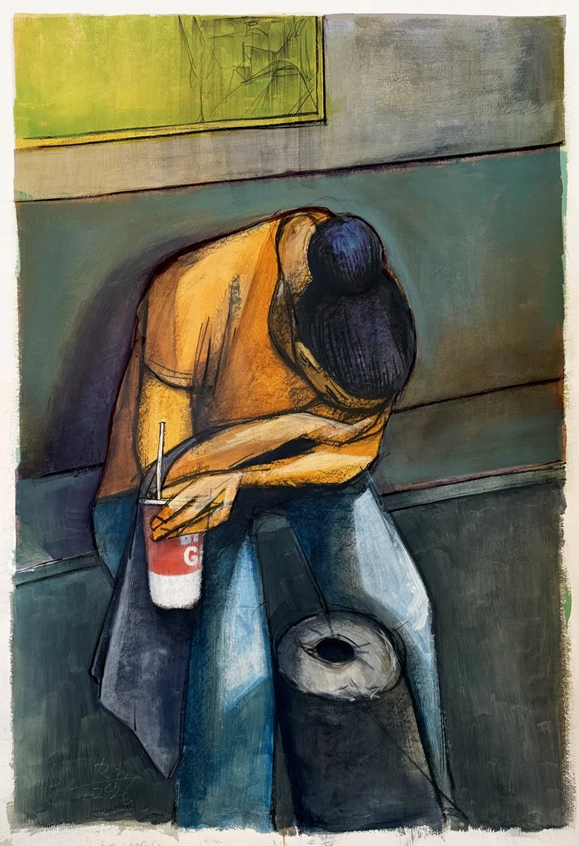 C Line Rider; R Williamson, acrylic and charcoal on Arches paper, digital accents; 31” x 44”; 3/26