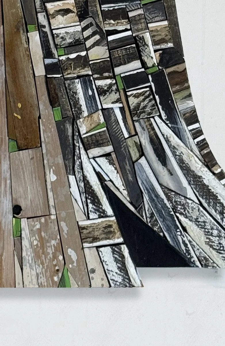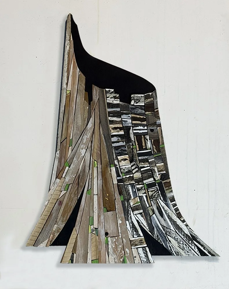 Charred Stump 2; R Williamson, wood scraps, plywood, acrylic paint, plaster; 27.5” wide x 35” tall x 1.5” deep, 6/25
