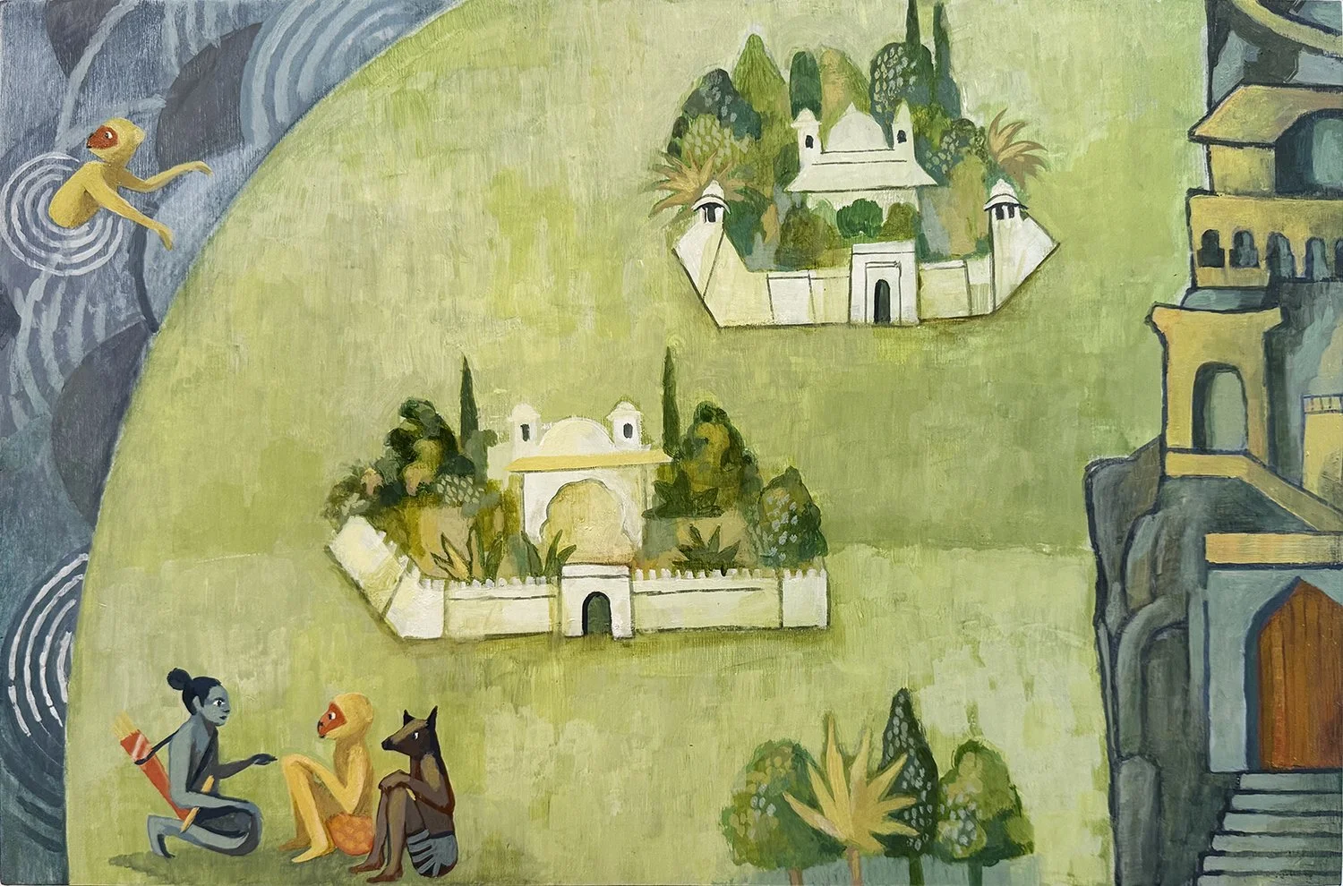 A new miniature painting based on Indian court painting from Rajasthan in the 17th century. The narrative storytelling aspect of the originals continues to exert some appeal to me. Without knowing the original tales, I enjoy adapting some of the motifs and characters and reimagining them.