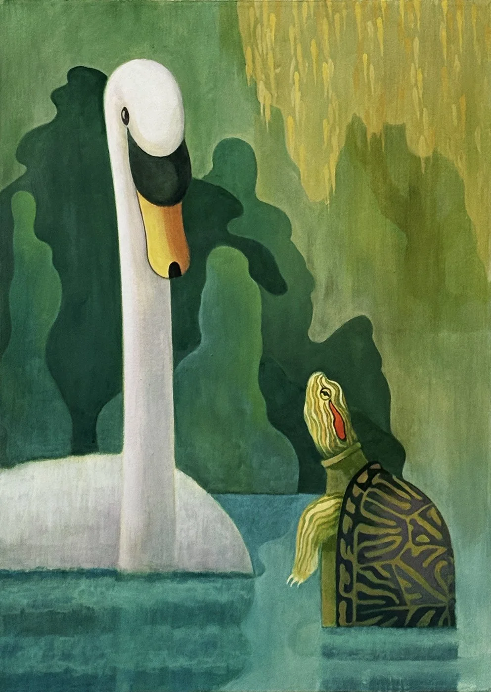A whimsical pencil sketch that became a painting almost by accident. A spy hopping turtle shares a moment with a cartoony swam. This composition originally had some tall reeds that the swam was peeking through but I ended up liking it better when it stayed more simple.