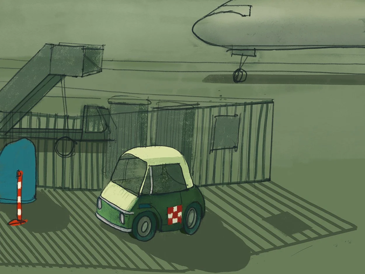 Napoli airport with Mini Fiat; R Williamson, digital painting; 10/25