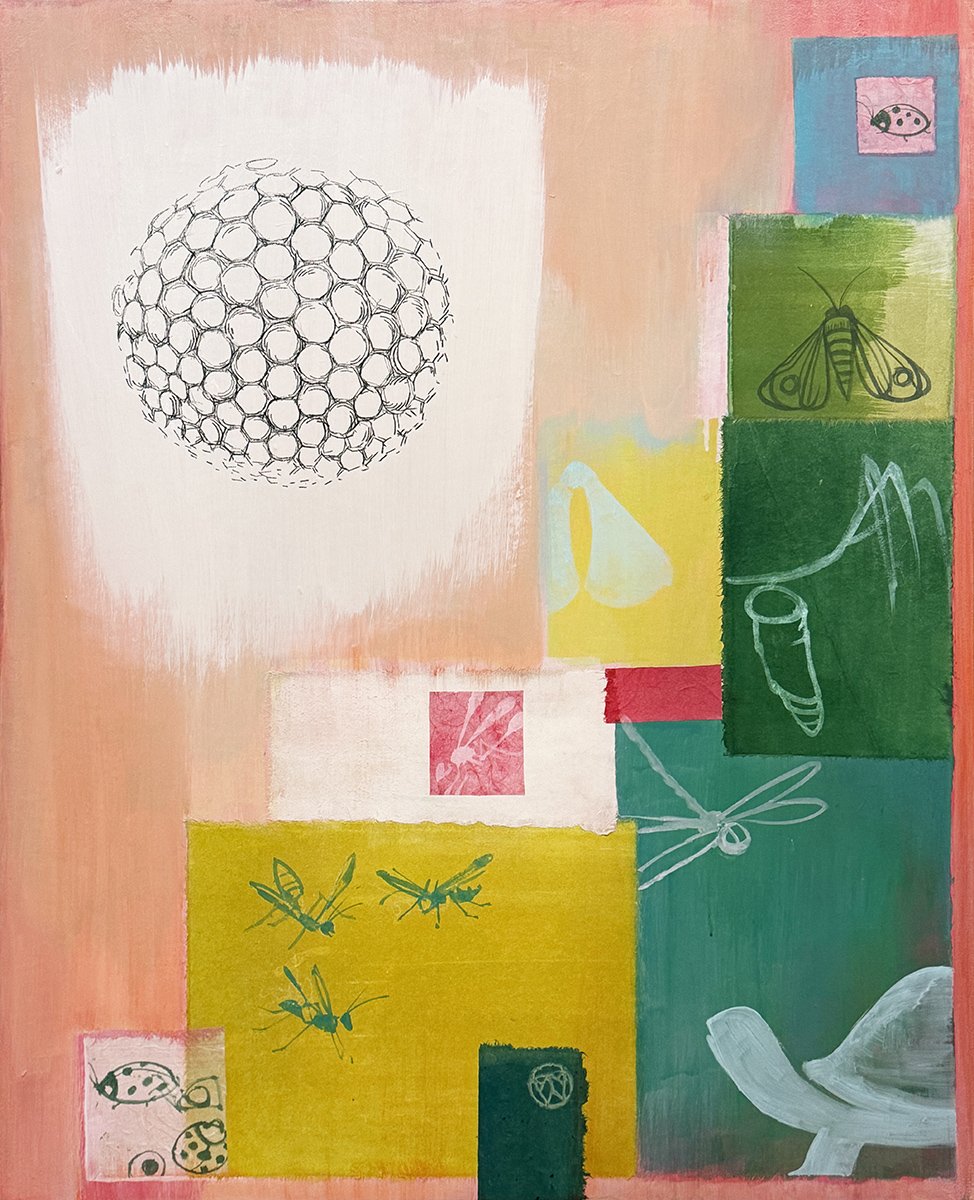 Salmon Hive is a recent reworking of an earlier painting and is now hanging with some other pieces in my current coffee house show, ‘Malachite Pond’. I have a new wall sculpture piece in the show which has a similar use of the salmon flesh type color so the two pieces will be more harmonious now (they share the same wall). As much as anything to do with the insect content of this one, it’s just fun with color & rhythm. The first version had way too much magenta (yikes!).