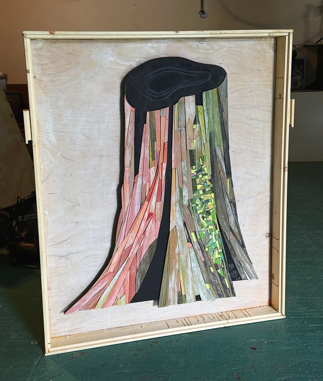 Salmon Stump (with Moss) in shipping crate; R Williamson; wood scrap, acrylic;ic, plywood; 2/26