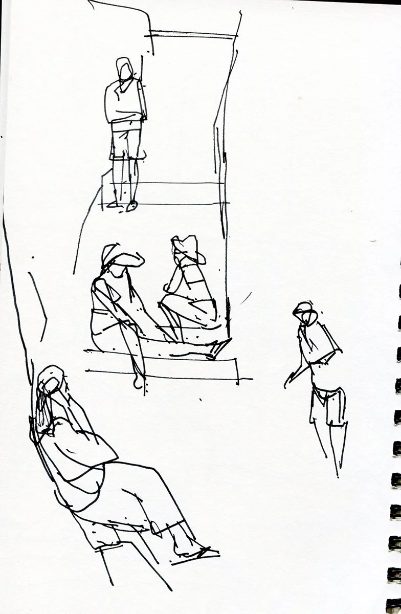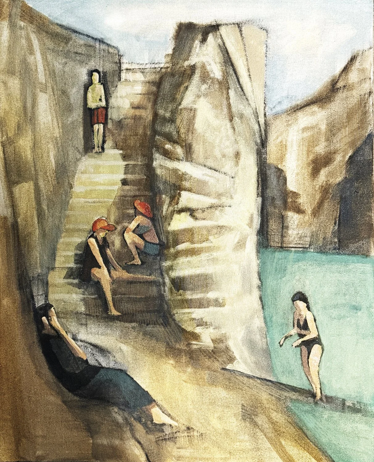 This scene is based on a recent memory and a pen sketch of the natural pool at Marina Serra in the Apulia region of Italy. Saltwater enters the shallow basin through a cave on one end and a slot on the other. With stairways carved out of the rock cliff which provides multiple perches from which you can get interesting sight lines down onto where people are bathing.