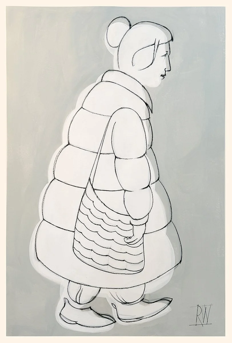 A large mixed media (paint/charcoal) piece on paper, based closely on a sketchbook drawing of a random person walking in the streets of NYC as the snow from the last large storm melted. Random, but standing out in the sense that this A-Line puffer was the puffiest that I have ever personally seen. A sort of Michelin-esque figure roaming the cold avenues.