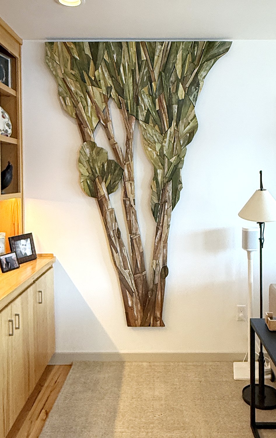 Late last year, (2025,) I received a commission for an artwork based on some tree trunk wall pieces that I had done some 6 years ago for the reception area at the Lodge at Saint Edwards. The clients had a very specific place in mind and wanted the piece to butt up to the ceiling. Although I had done those conifer trunks and many stump-type versions, this would be the first time that I had portrayed foliage of any quantity and as such, the idea represented something new. Always a good inducement. While it took me much longer than expected to finish the piece, eventually ‘Understory 1’ was complete and got installed yesterday at the residence at the north end of Lake Washington.